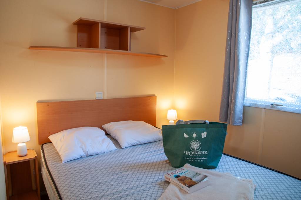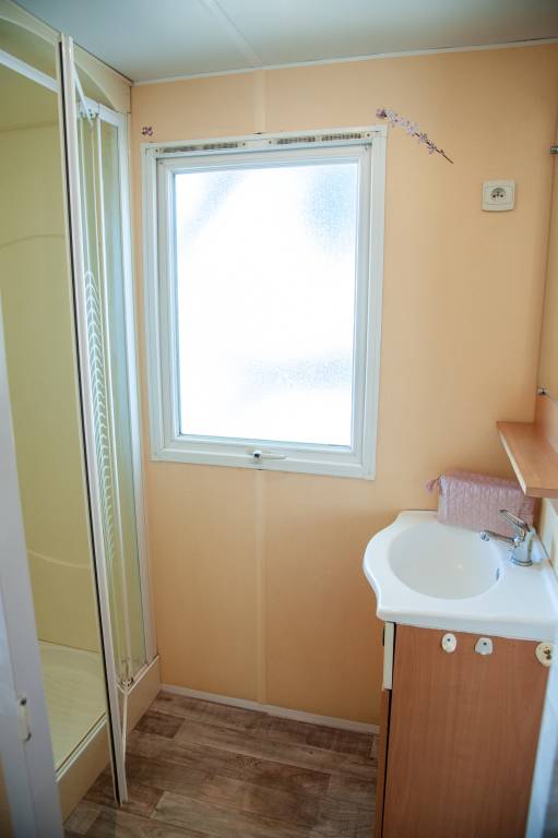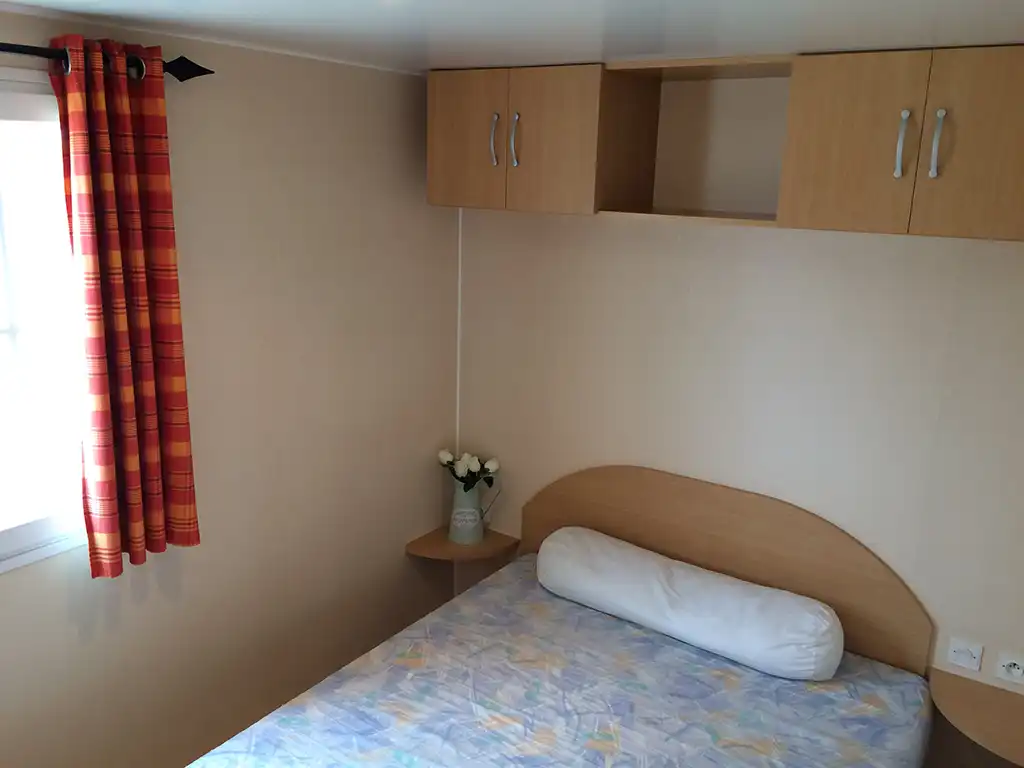 Le mobil home se compose d'une cuisine équipée (ustensiles inclus) ouverte sur le séjour (1 couchage) et sur la terrasse, d'une chambre avec lit double et d'une chambre avec deux lits simples, salle de douche et WC séparés.