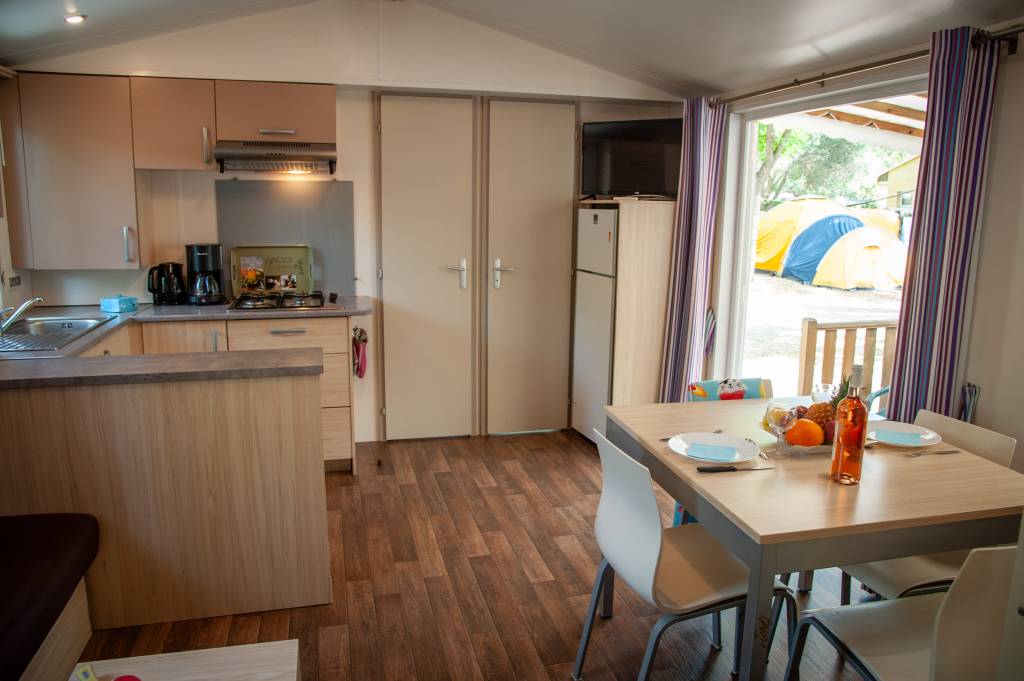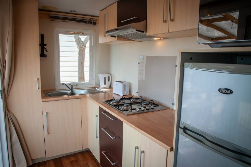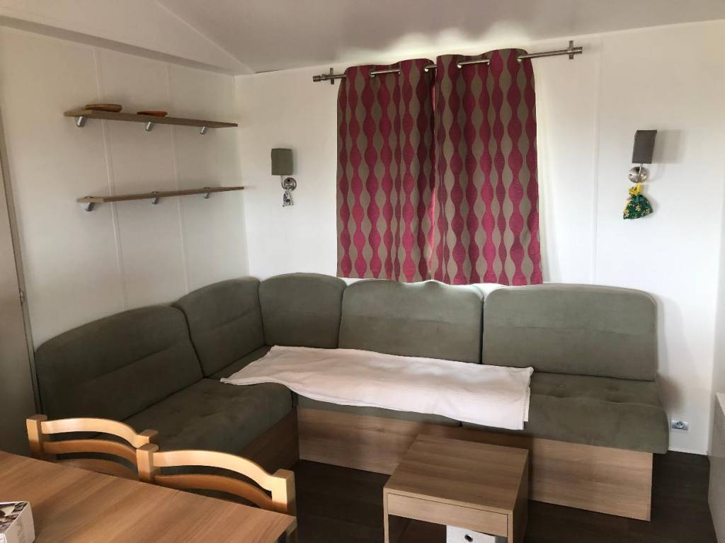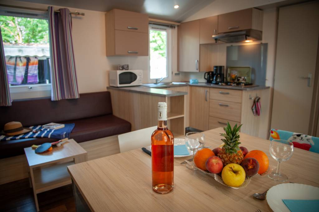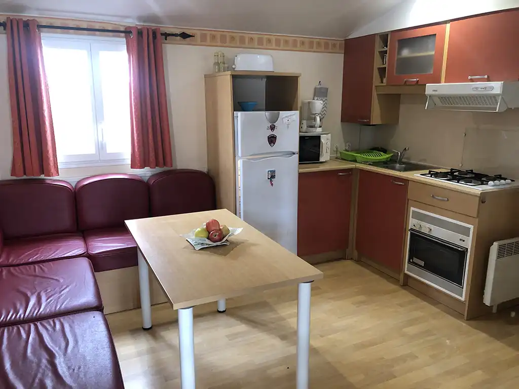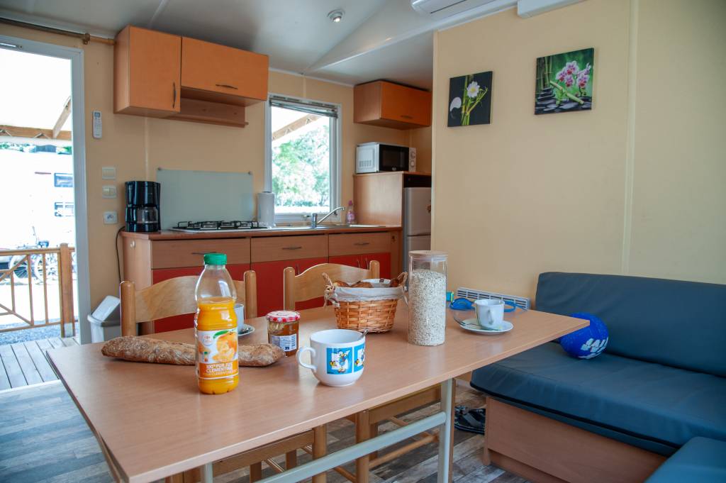Le mobil home se compose d'une cuisine équipée (ustensiles inclus) ouverte sur le séjour et sur la terrasse, d'une chambre avec lit double et de 2 chambres avec deux lits simples, salle de douche et WC séparés.