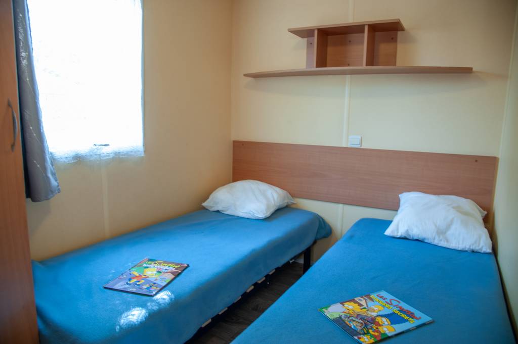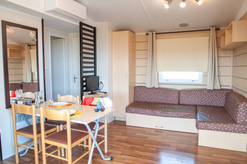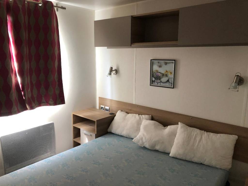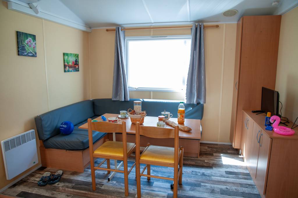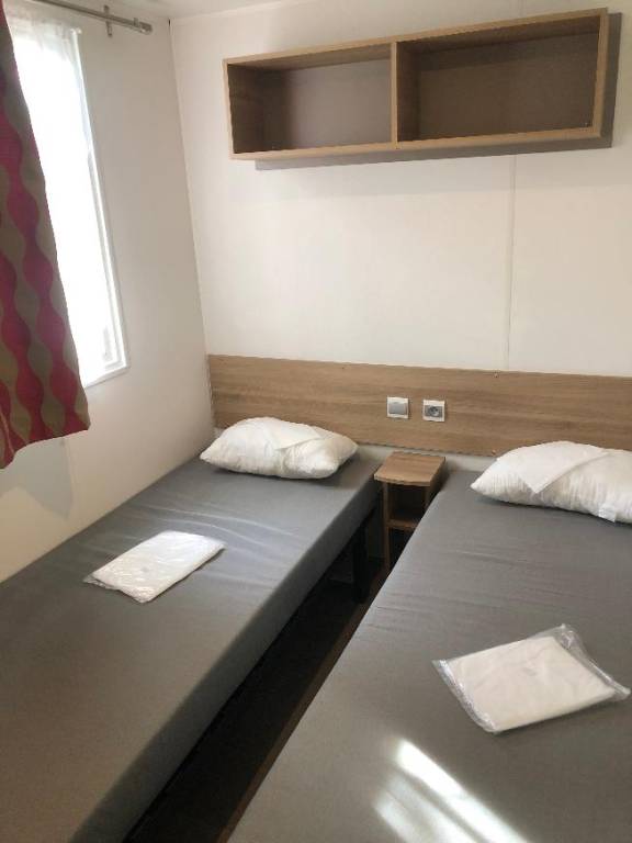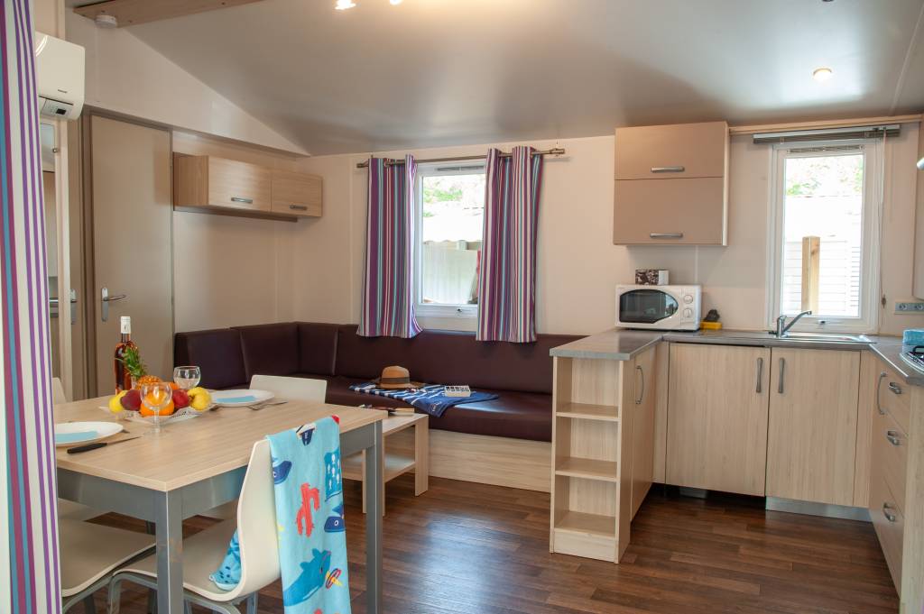 Le mobil home se compose d'une cuisine équipée (ustensiles inclus) ouverte sur le séjour et sur la terrasse, d'une chambre avec lit double et de 2 chambres avec deux lits simples, salle de douche et WC séparés.