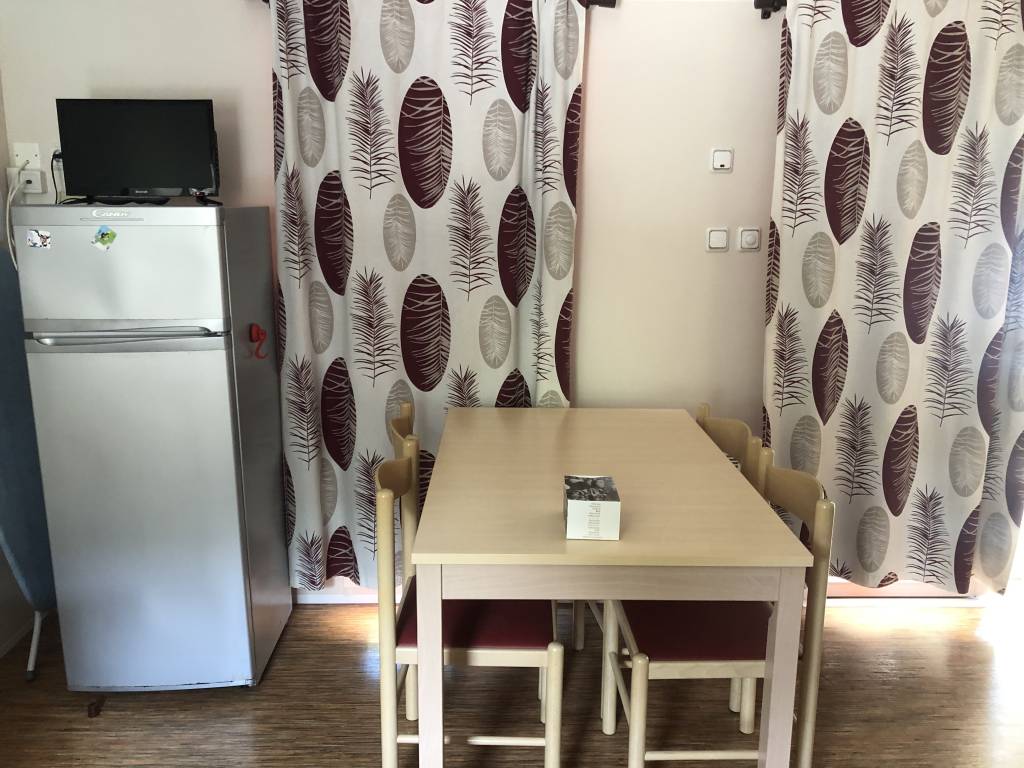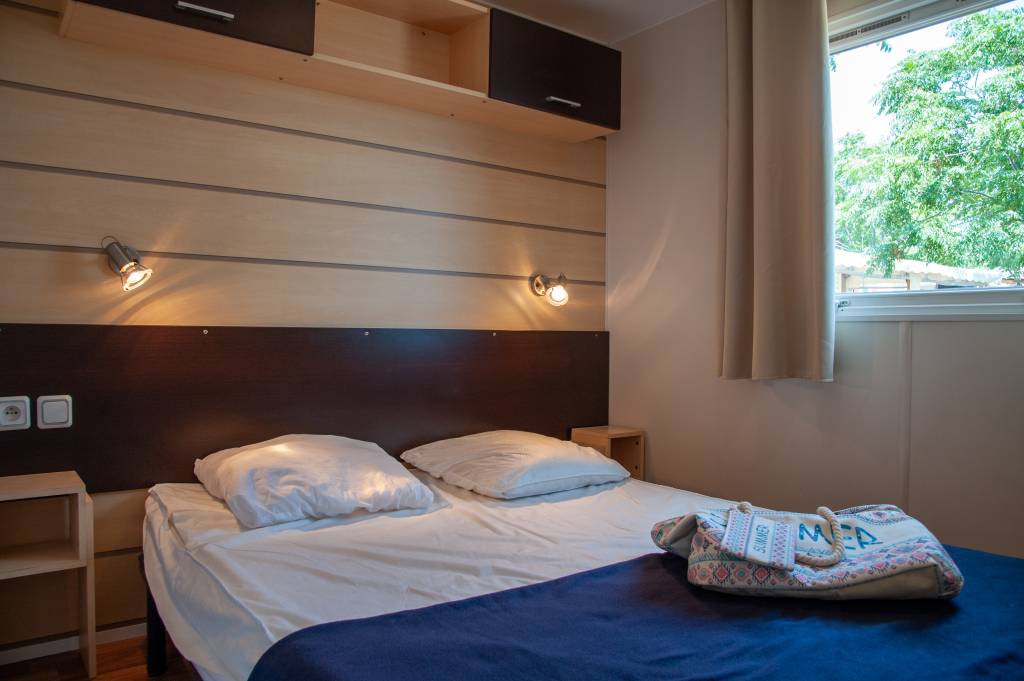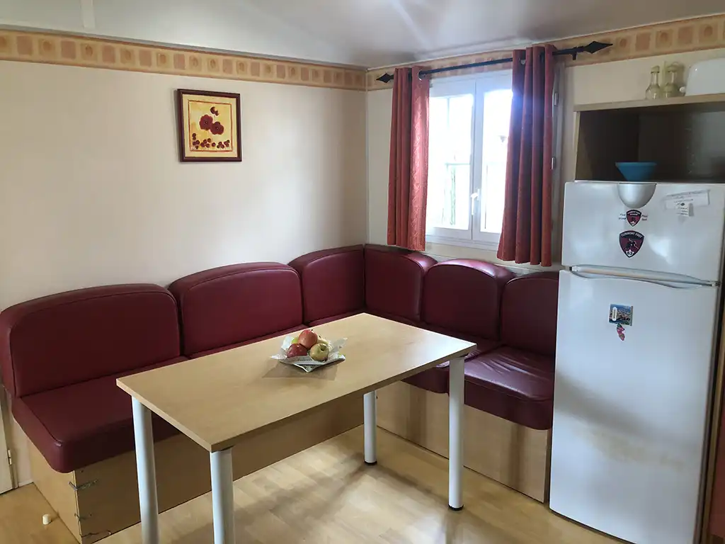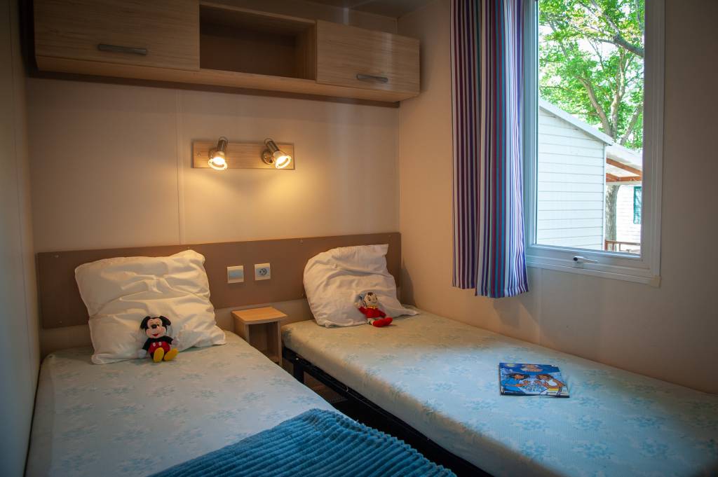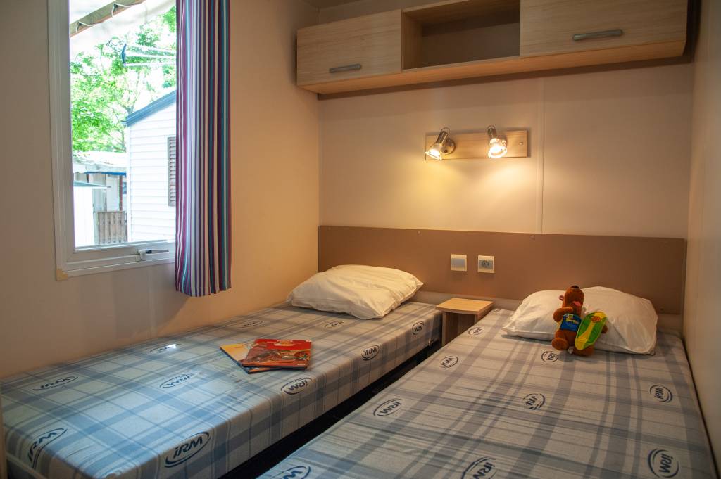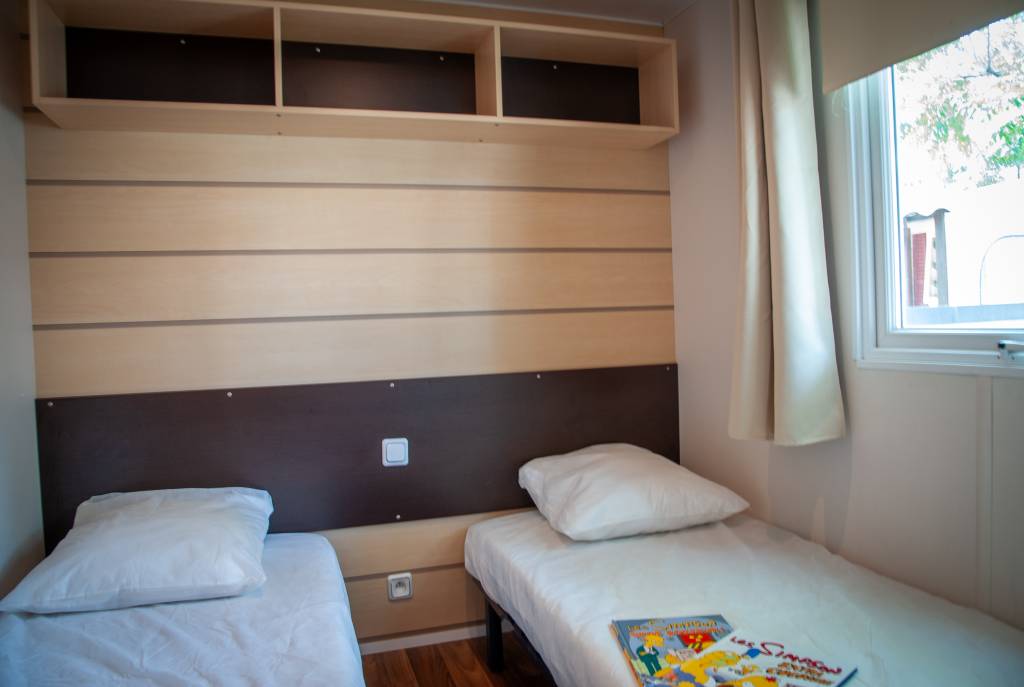 Le mobil home se compose d'une cuisine équipée (ustensiles inclus) ouverte sur le séjour et sur la terrasse, d'une chambre avec lit double et de 2 chambres avec deux lits simples, salle de douche et WC séparés.