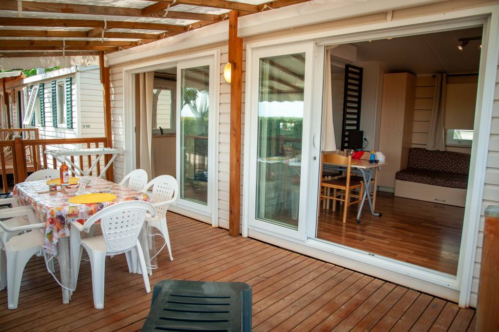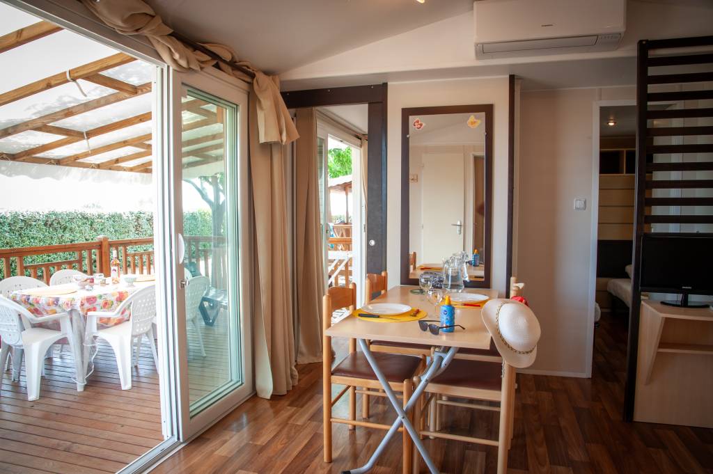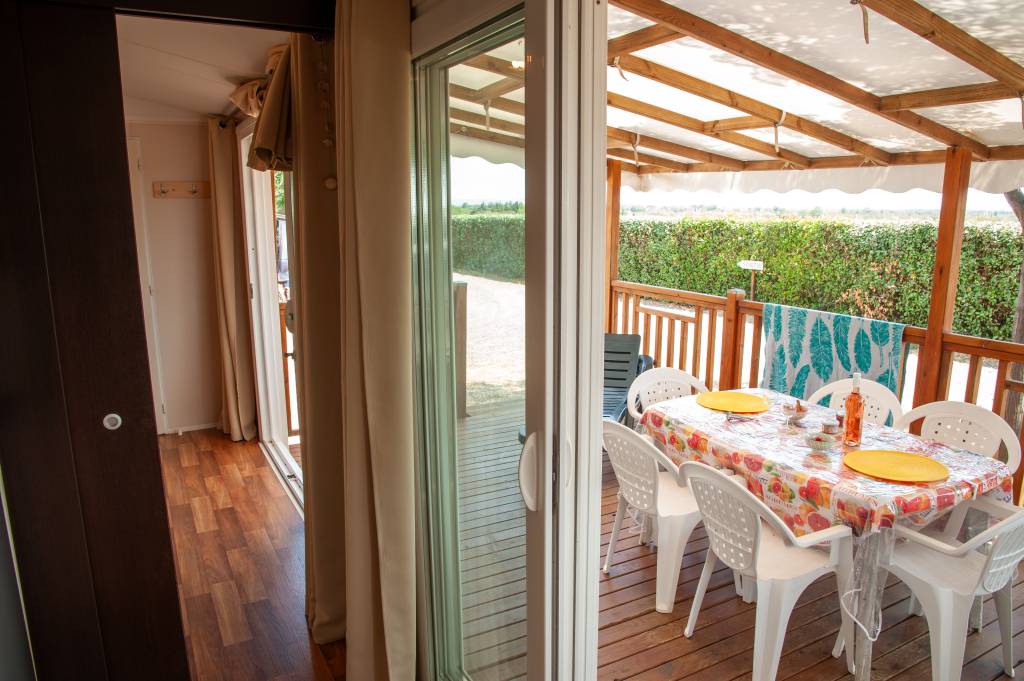 Le mobil home 6 personnes Confort + est très lumineux avec ses grandes baies vitrées donnant sur une terrasse couverte.