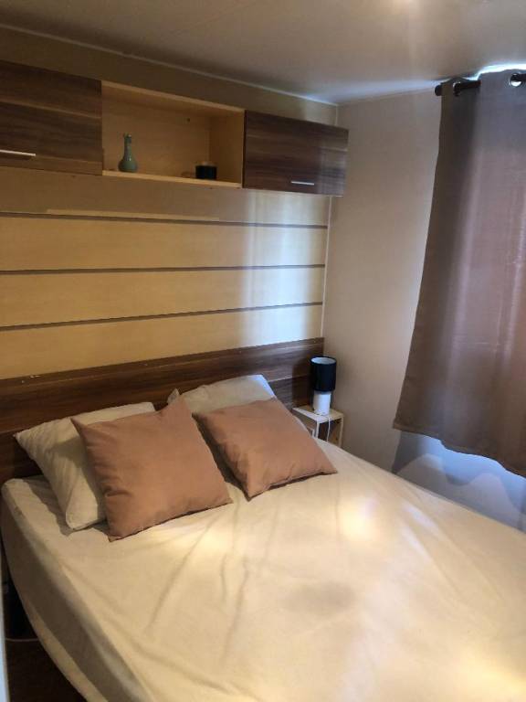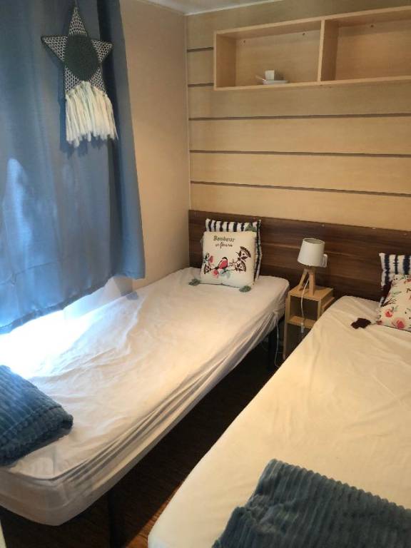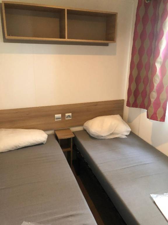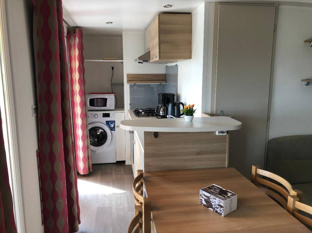 Mobil home équipé d'une cuisine (ustensiles inclus), machine à laver; d'un séjour, d'une chambre avec lit double et de 2 chambres avec deux lits simples, salle de douche et WC séparés.